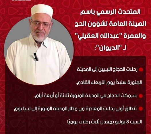 المتحدث باسم الهيئة العامة لشؤون الحج والعمرة عبدالله العقيلي لـ منصة الديوان ستنطلق أولى رحلات المغادرة من مطار المدينة المنورة إلى ليبيا في الثامن من شهر يوليو الحالي.