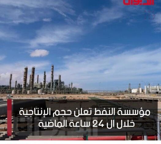 المؤسسة الوطنية للنفط تعلن أن إنتاج النفط الخام بلغ مليون و204 ألف برميل يوميًا وبلغ إنتاج المكثفات 54 ألف برميل يوميًا خلال الـ 24 ساعة الماضية