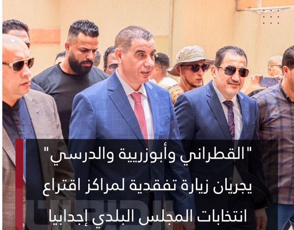 نائب رئيس الحكومة الليبية علي القطراني يجري رفقة وزير الداخلية عصام أبوزريبة وجهاز الأمن الداخلي أسامة الدرسي زيارة تفقدية إلى مراكز اقتراع انتخابات المجلس البلدي إجدابيا للاطلاع على سير العملية الانتخابية والأوضاع الأمنية داخل المراكز وأشاد أبوزريبة بالجهود التي تبذلها مراكز الاقتراع والأجهزة الأمنية في إجدابيا وأكد القطران على حرص الحكومة على توفير الدعم اللازم لضمان سير الانتخابات بشفافية ونزاهة وتسهيل ممارسة حقوق المواطنين الانتخابية.