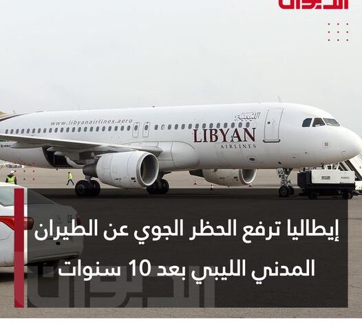إيطاليا ترفع الحظر الجوي على الطيران المدني الليبي المفروض عليه منذ نحو 10 سنوات وتعلن استئناف الرحلات بدءا من سبتمبر المقبل حسبما أكدت صفحة رئيس حكومة الوحدة الوطنية عبدالحميد الدبيبة على تويتر