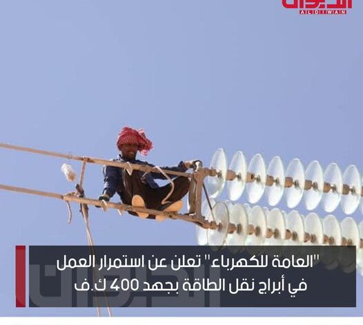 العامة للكهرباء تعلن عن استمرار العمل في ابراج نقل الطاقة بجهد 400 ك.ف