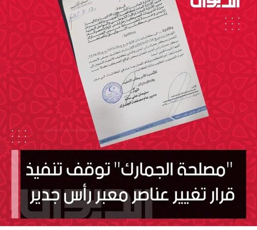 مصلحة الجمارك توقف تنفيذ قرار وزير الداخلية بـ حكومة الوحدة الوطنية بشأن تغيير عناصر معبر رأس اجدير بعد ساعات من صدوره.