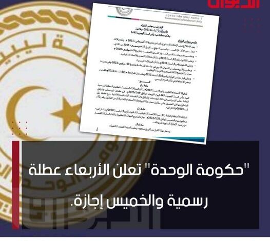 حكومة الوحدة تعلن الأربعاء عطلة رسمية والخميس إجازة