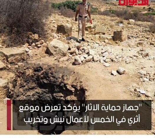 جهاز حماية الشرطة السياحية والآثار يفيد بتعرّض الموقع الأثري قصر القوس ببلدية الخمس لأعمال نبش وتخريب بحثاً عن الكنوز ويؤكد اتخاذ كافة الإجراءات القانونية حيال الواقعة.