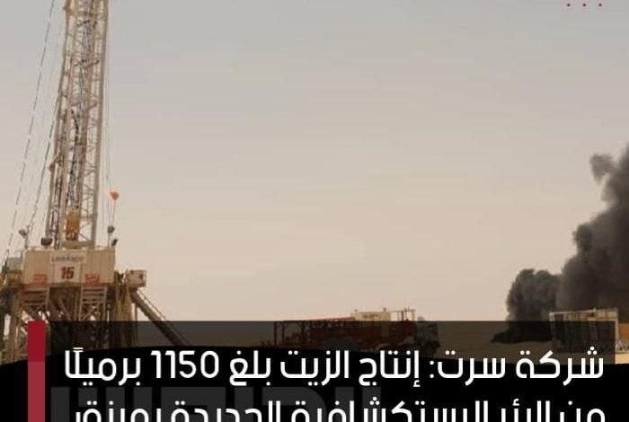 شركة سرت لإنتاج وتصنيع النفط والغاز تعلن أن كمية الزيت المستخرج من البئر الاستكشافية J3-NC101 التي تم حفرها حديثًا بحوض مرزق بلغت حوالي 1150 برميل يوميًا