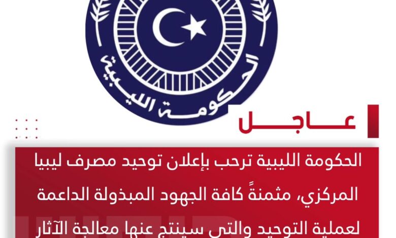 الحكومة الليبية ترحب بإعلان توحيد مصرف ليبيا المركزي مثمنةً كافة الجهود المبذولة الداعمة لعملية التوحيد والتي سينتج عنها معالجة الآثار المترتبة عن الانقسام.