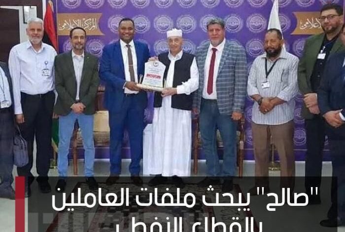 رئيس مجلس النواب عقيلة صالح يناقش في القبة مع رئيس الاتحاد العام لعمال النفط والغاز سعد دينار الفاخري وعدد من رؤساء الاتحادات والنقابات بالشركات النفط قضايا حقوق ومرتبات العاملين في قطاع النفط والغاز.