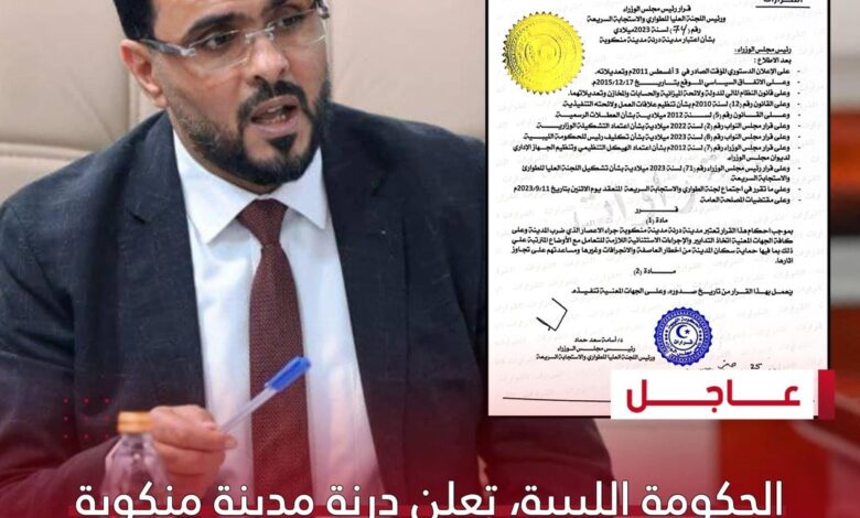 الحكومة الليبية تعلن درنة مدينة منكوبة جراء الإعصار الذي طالها منذ ليل أمس.