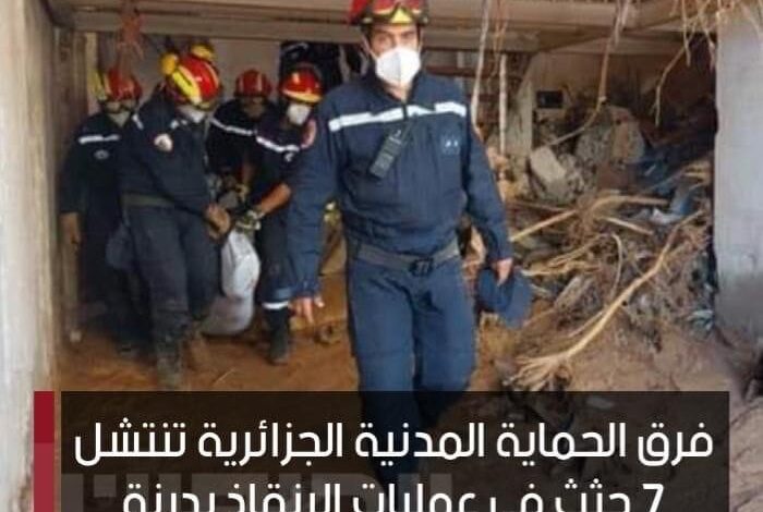 فرق الحماية المدنية الجزائرية المساعدة في عمليات الإنقاذ بـ درنة تنتشل 7 جثث متوفين ليصل إجمالي عدد الضحايا الذي تم انتشالهم إلى 18 من بينهم 11 رجلاً و7 نساء .