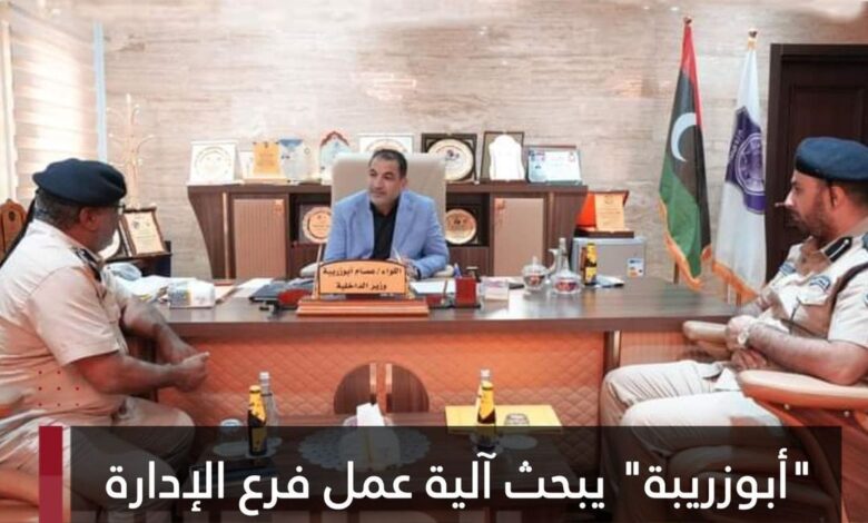 وزير الداخلية بـ الحكومة الليبية عصام أبوزريبة يناقش مع رئيس فرع الإدارة العامة لطيران الشرطة بنغازي المشاكل والتحديات التي تواجه طيران الشرطة في الوقت الحالي التي تؤثر على كفاءة الأداء وسبل حلها بالإضافة إلى دور الإدارة في مساعدة فرق الإنقاذ والإغاثة في مدينة درنة المنكوبة لتسهيل عمليات انتشال الجثث.