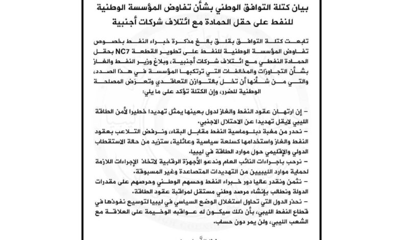 وأكدت الكتلة رفضها لأي تلاعب في عقود النفط والغاز واستخدامها كأداة سياسية تهدف لتحقيق مصالح شخصية أو عائلية محذرة من أن ذلك سيؤدي إلى زيادة التوترات الدولية والإقليمية حول موارد الطاقة الليبية.