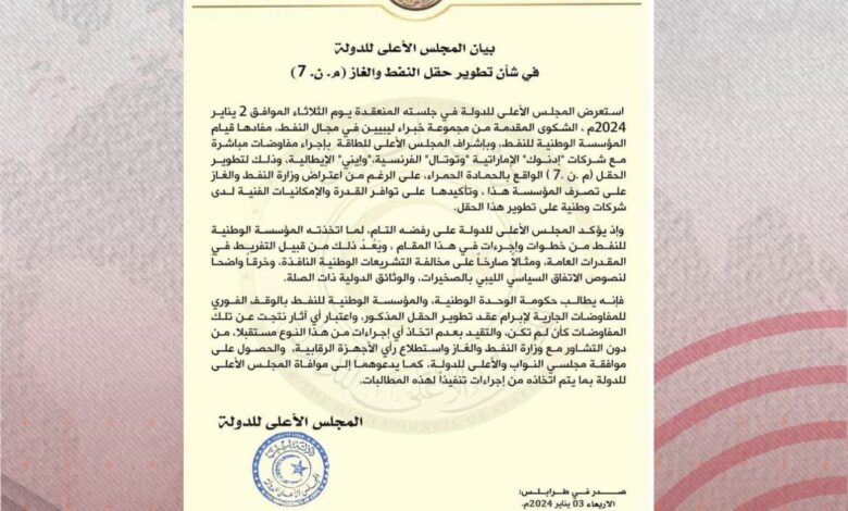 الأعلى للدولة يطالب حكومة الوحدة بوقف اتفاقية تطوير حقل الحمادة الحمراء
