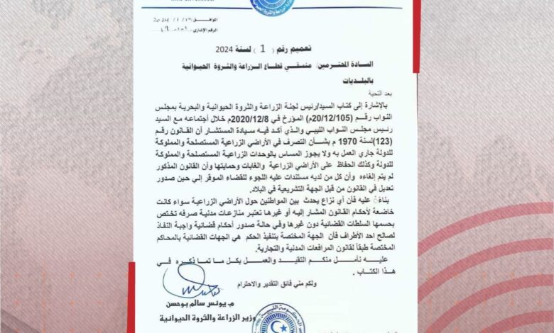 أصدر وزير الزراعة والثروة الحيوانية في الحكومة الليبية يونس بوحسن توجيهًا يعمم فيه على منسقي قطاع الزراعة والثروة الحيوانية في البلديات بشأن التعامل مع نزاعات الأراضي الزراعية.