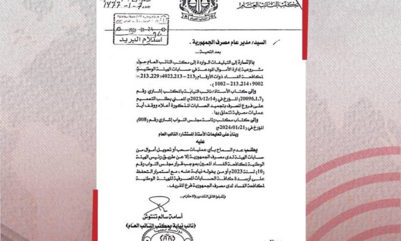 طالب نائب النيابة بمكتب النائب العام، مدير عام مصرف الجمهورية بعدم السماح بأي عمليات سحب أو تحويل أموال من حسابات الهيئة الوطنية لمكافحة الفساد لدى مصرف الجمهورية، إلا بإذن من رئيس الهيئة المكلف حاليًا بقرار من رئيس مجلس النواب “اجديد معتوق اجديد”، أو من يخوله نيابة عنه ، مُطالبًا باستمرار التحفظ على أرصدة جميع الحسابات المصرفية للهيئة لدى مصرف الجمهورية فرع المقريف.